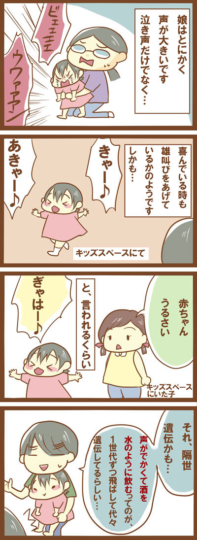 特に笑い声やくしゃみがすごいらしく、娘も嬉しい時の喜びの雄叫びがかなり大きいので、まさかの遺伝の可能性が…