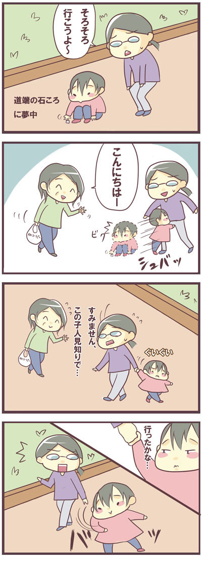 素早く動く瞬間 2016年05月19日 最近、お散歩をしていても娘が手を繋いでくれなくなることが増え困っています。以前ブログでも描いた通り、道端に落ちているゴミに飛びつこうとするのにも困りますが、石ころや草などに興味を持って遊びだすと一歩も動かなくなりますそんな娘ですが…人見知りゆえ、人が話し ... 続きを読む