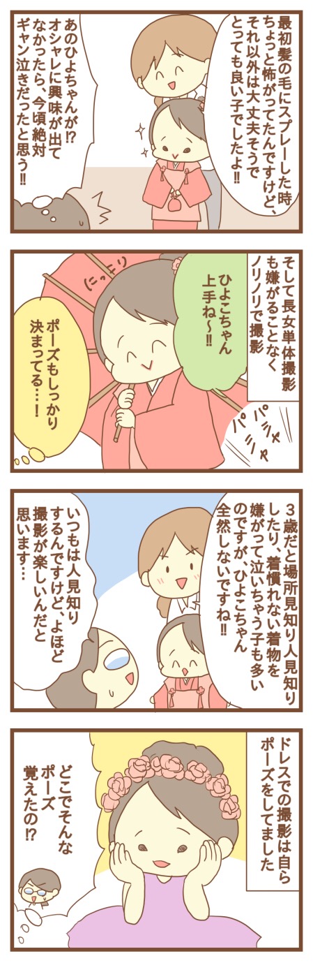 【七五三前撮り⑥〈完〉】写真撮影次女の場合 2018年06月11日 4月に長女の七五三前撮りをした時のお話です。 その1 その2 その3 その4 その5 一コマ目誤字です 【誤】現所見知り→【正】場所見知り なぜ現所と書いてしまったのか… ノリノリの長女とは反対に人見知り場所見知り全開の次女。 しかし出来上がった写真を見ると笑顔ば ... 続きを読む