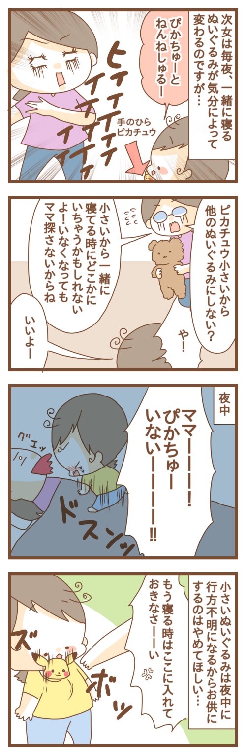 寝るときの相棒選びでやめて欲しいこと 2019年08月30日 すみません、前回の記事で寝たふりハッピー編の予告をしたのですが、その前にもう一つ就寝時の困った話がありましたので今回はそちらの方を先に。 手のひらサイズの小さいぬいぐるみだと寝ている間にどこかへいってしまい、夜中に目覚めた次女に起こされて捜索を手伝わ ... 続きを読む