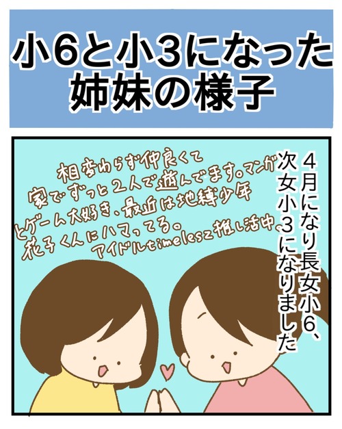 小6と小3になった姉妹の様子 2026年04月14日 4月になったので子供達の最近の様子です。 姉妹共に仲の良いお友達とクラスになって楽しそうです! (クラスが違ったときは学校ヤダと言うことも時々あって心配でした😂) 長女はついに小6で小学校生活ラストです。 新中学生を見てこんなこと言ってた子が来年、中 ... 続きを読む