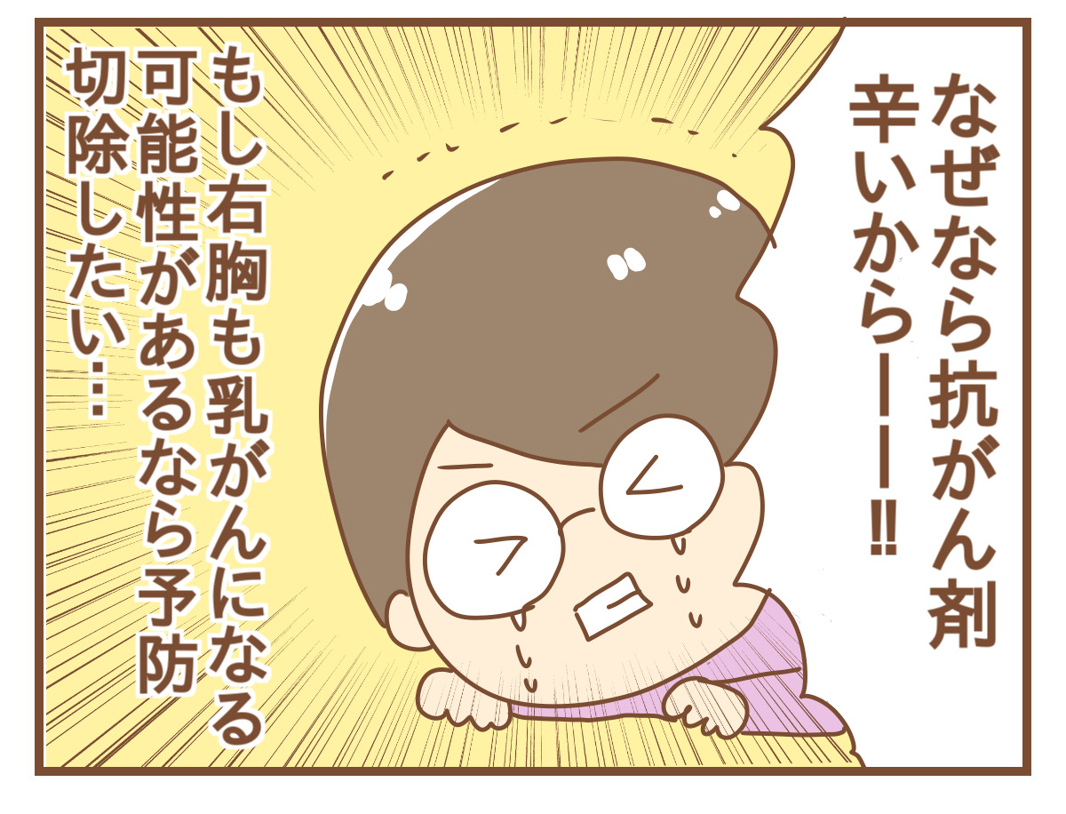 抗がん剤前に遺伝子検査の説明を少し聞いたときは保留にしていましたが、いざ抗がん剤が始まったら辛すぎて「もし遺伝性乳がんだったら予防切除もしたい」という気持ちが出てきました。