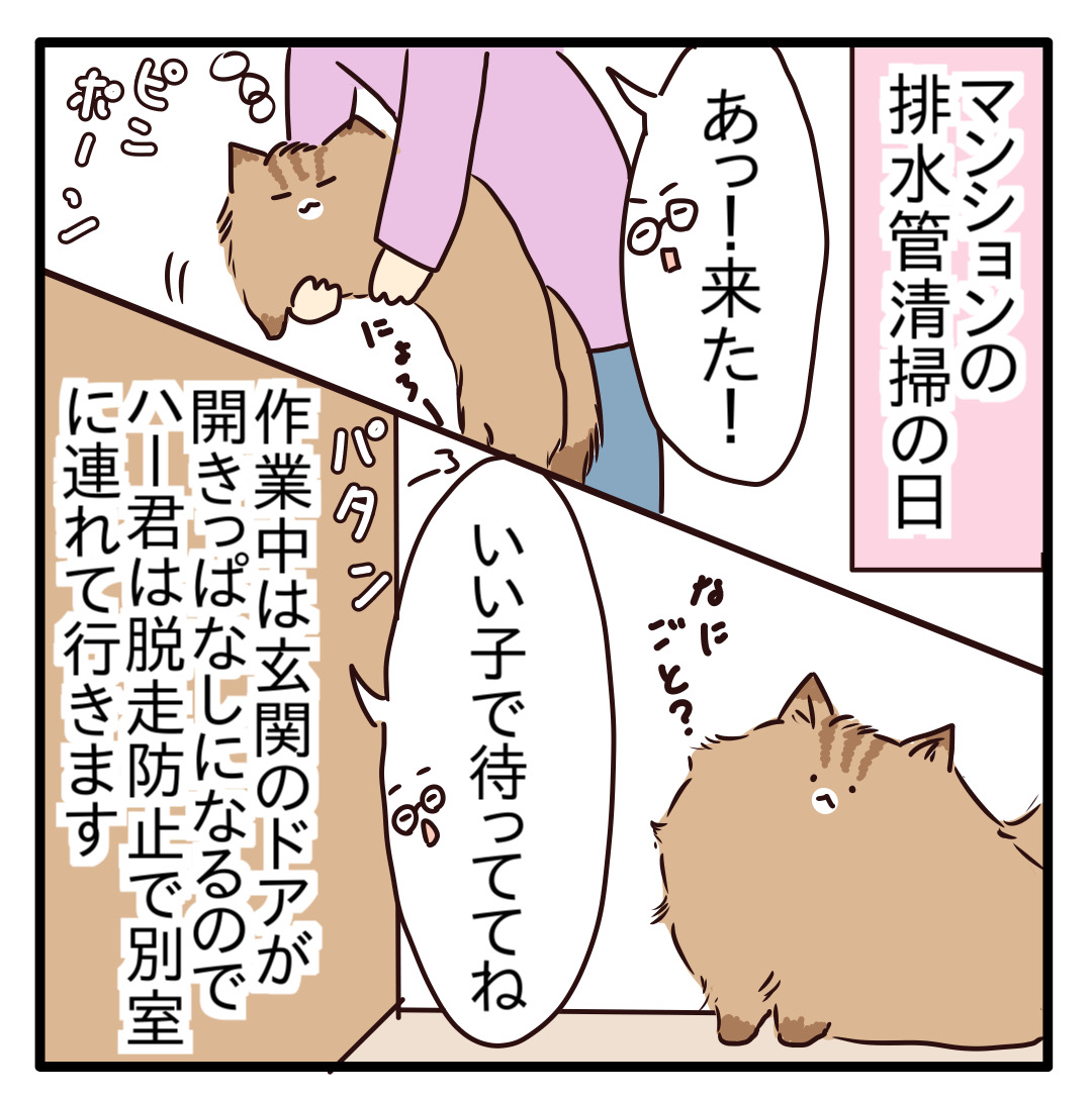 インターホン鳴るだけで腰を低くして逃げる子なので排水口清掃の方が入ってきたらどこかに隠れて怖がって脱走はしないとは思うけど…でも念のため😭