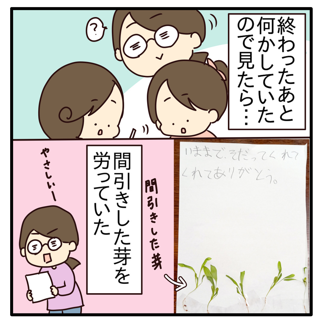 間引きした芽もいたわるその優しい気持ちをこれからも持ちながら大きくなってほしいです😊