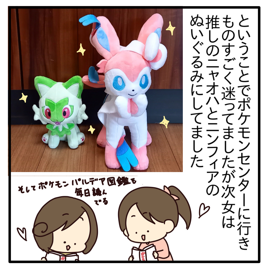 悩んだ末、ニャオハとニンフィアのぬいぐるみを選びました。