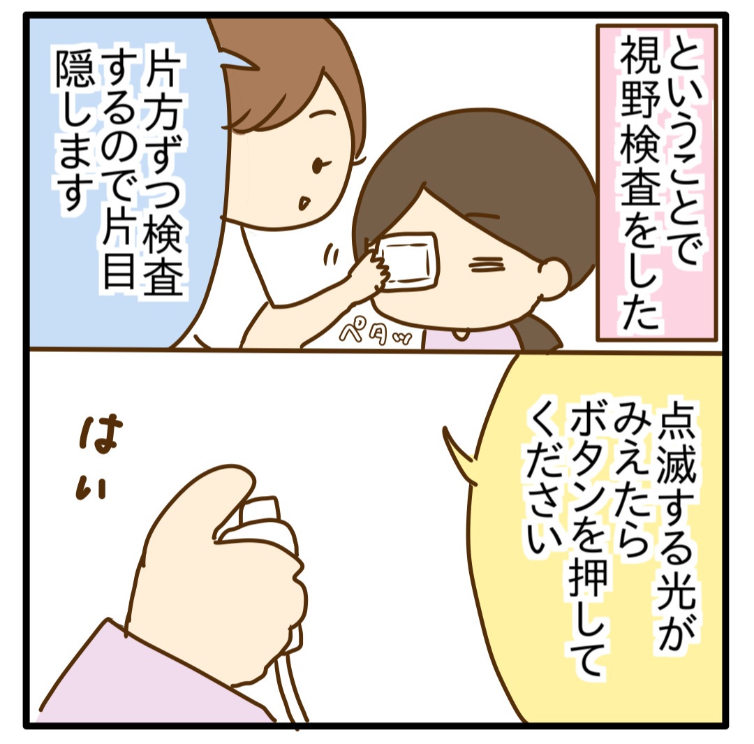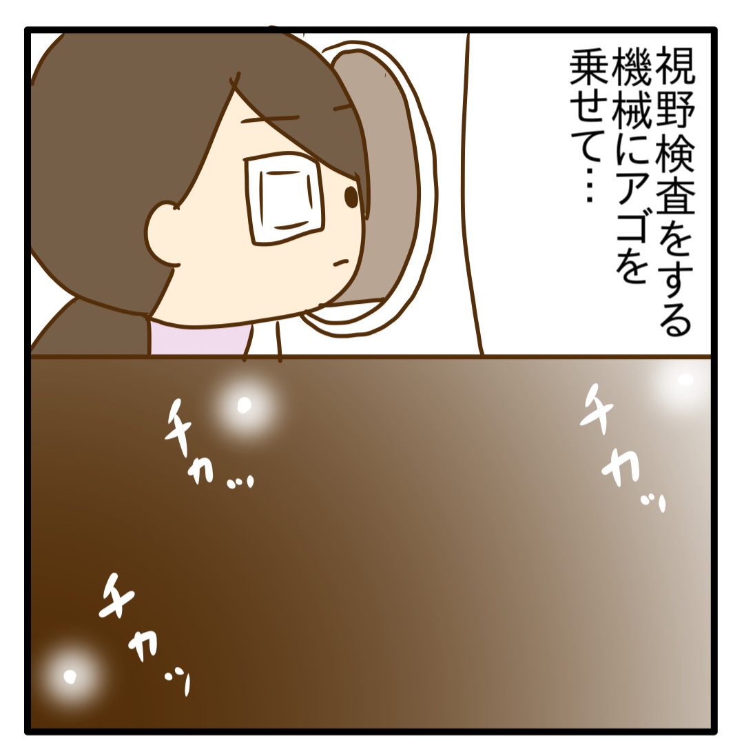 検査は機械にアゴを乗せ顔を動かさず、一点を見つめつつ、あちこちで光る光が見えたらボタンを押すという検査でした。