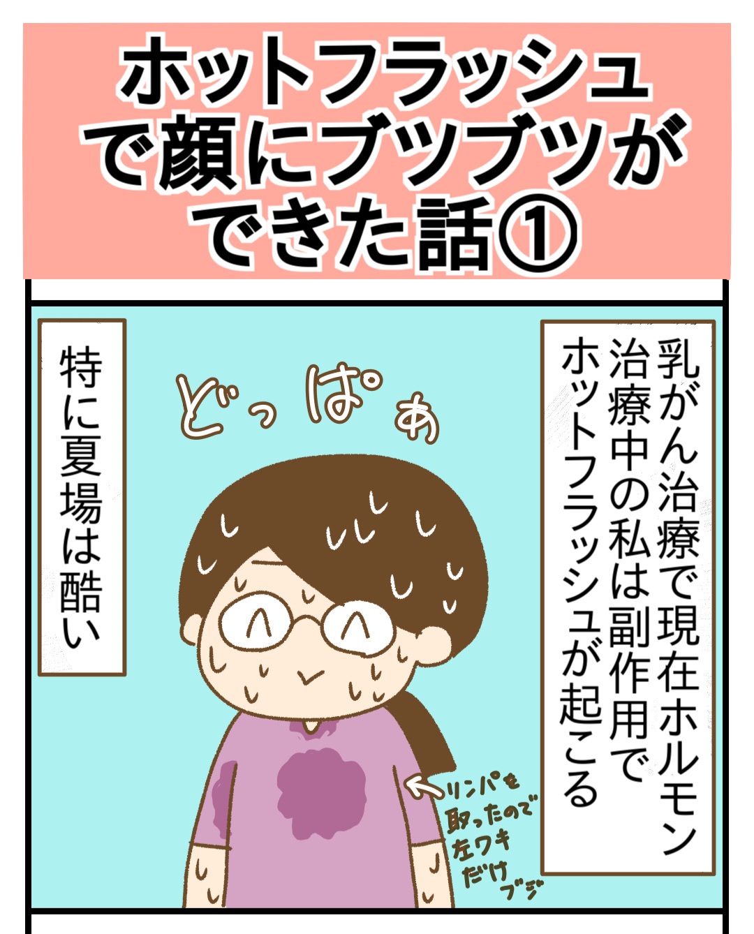 ホットフラッシュで顔にブツブツができた話① 2025年11月14日 ブログでもちょこちょこ描いてますが乳がんのホルモン治療の副作用でホットフラッシュが酷いです。 そして昨年の夏、目の下あたりにぶつぶつとしたものができていることに気づきました。 続きます。 ▼ブログの乳がん闘病記を電子書籍にまとめて読みやすくしました!無料なのでぜひご覧ください! ▼2つのランキングに参加中!どちらも応援クリック頂けると更新の励みになります! ▼アプリでフォローしていただきメニューの通知設定で当ブログを選択するとブログ更新通知が届きます!フォローしていただけると嬉しいです! 「術後の治療(分子標的薬&ホルモン治療)」カテゴリの最新記事 < 前の記事次の記事 > コメント コメントフォーム 名前 コメント 記事の評価 リセット リセット 顔 星 情報を記憶 コメントを投稿する