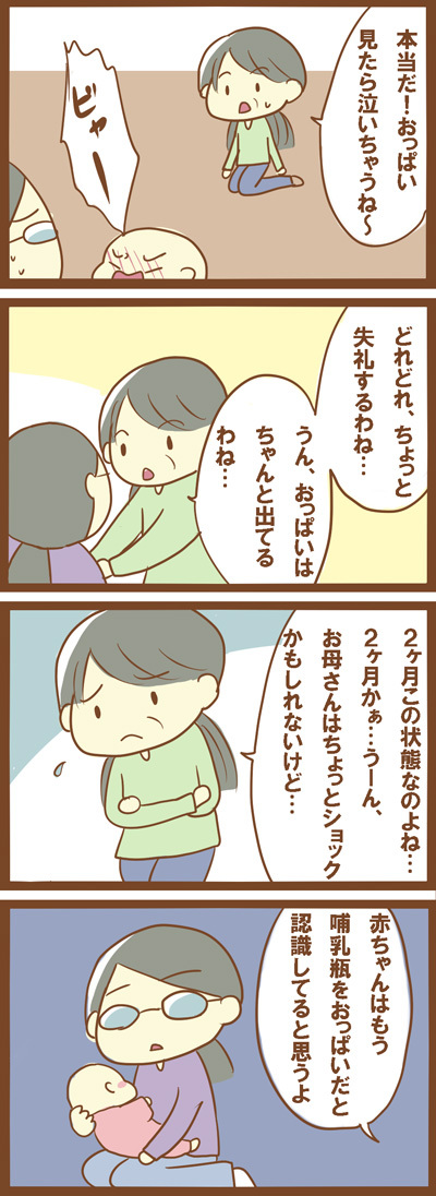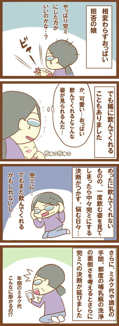 【母乳拒否6】ミルク育児への決断 2016年10月01日 授乳話その6です。助産師さんに「赤ちゃんは哺乳瓶がおっぱいだと思っている」と言われ…助産師さんの言葉を聞いてそういえば授乳の時、笑えてたかな?心に余裕がない時は、「なんでおっぱい飲んでくれないの?」そう思いながら泣きながらあげていた…そう思うと娘に申し訳な ... 続きを読む